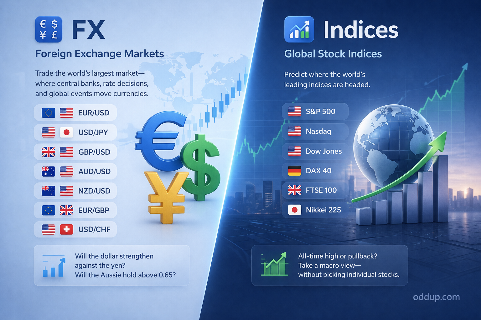 Oddup features markets on the S&P 500, Nasdaq, Dow Jones, DAX 40, FTSE 100, and Nikkei 225.